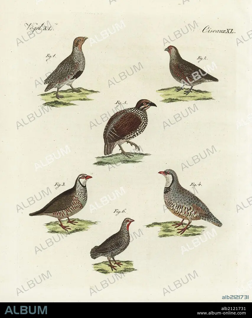 Grey partridge, Perdix perdix, male 1 and female 2, red-legged partridge, Alectoris rufa 3, rock partridge, Alectoris graeca 4, Chinese Francolin, Francolinus pintadeanus 5, and red-necked spurfowl, Pternistis afer 6. Handcoloured copperplate engraving from Bertuch's "Bilderbuch fur Kinder" (Picture Book for Children), Weimar, 1798. Friedrich Johann Bertuch (1747-1822) was a German publisher and man of arts most famous for his 12-volume encyclopedia for children illustrated with 1,200 engraved plates on natural history, science, costume, mythology, etc., published from 1790-1830.