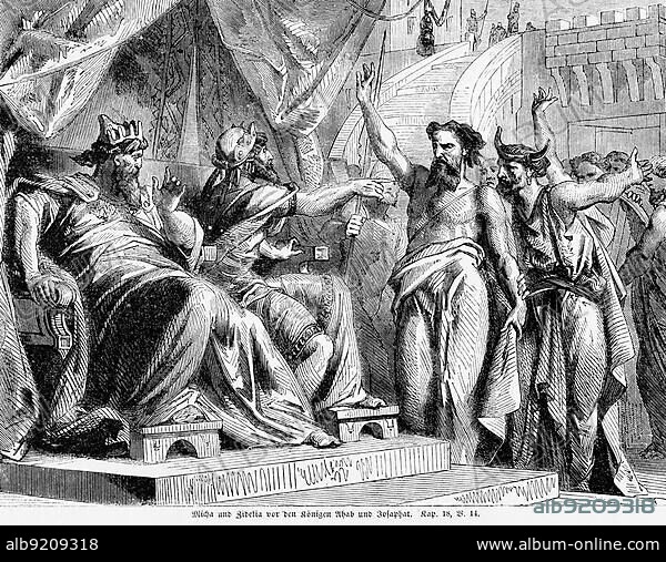 Micah and Zidekiah in front of the kings Ahab and Jehoshaphat, kings, Ramoth, Gilead, dispute, crowd, dispute, throne, palace, Bible, Old Testament, Second Book of Chronicles, chapter 18, verse 14, historical illustration c. 1850, Near East.