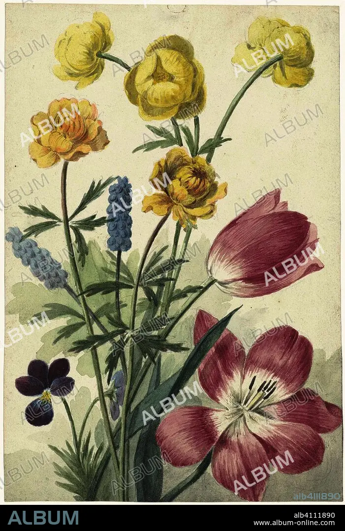 Caption: Bouquet of tulips, violets, blue grapes and dotters. Draughtsman: Willem van Leen. Dating: 1763 - 1825. Measurements: h 210 mm × w 144 mm.
