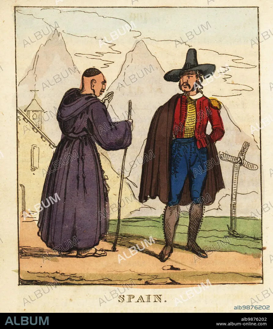 Caption: Costumes of Spain, 19th century. Spanish monk in habit and sandals with staff on a pilgrimage. Gentleman in wide-brim hat, cape, jacket with epaulettes, breeches and gaiters. Spain. Handcoloured copperplate engraving from The World in Miniature, or Panorama of the Costumes, Manners & Customs of All Nations, John Bysh, London, 1825.