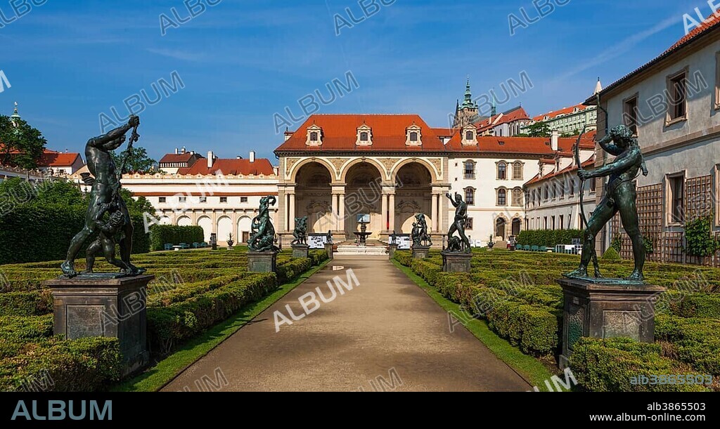 Palais Waldstein or Wallenstein Palace with Wallenstein Garden with bronze statues, Malá Strana, Prague, Czech Republic, Europe.