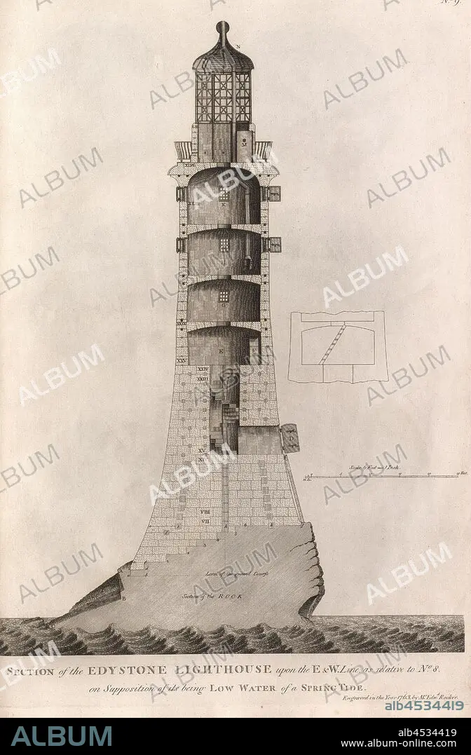 Caption: Section of the Edystone Lighthouse upon the E&W. Line, ..., Cross section of the Edystone lighthouse from the 18th century, signed: Engraved in the Year 1763 by Mr. Edwd., Rooker, no. 9, after p. 198, Rooker, Edward, 1763, John Smeaton: A narrative of the building and a description of the construction of the Edystone lighthouse with stone: to which is subjoined, an appendix, giving some account of the lighthouse on the spurn point, built upon a sand. London: printed for the author by H. Hughs: sold by G. Nicol, 1791