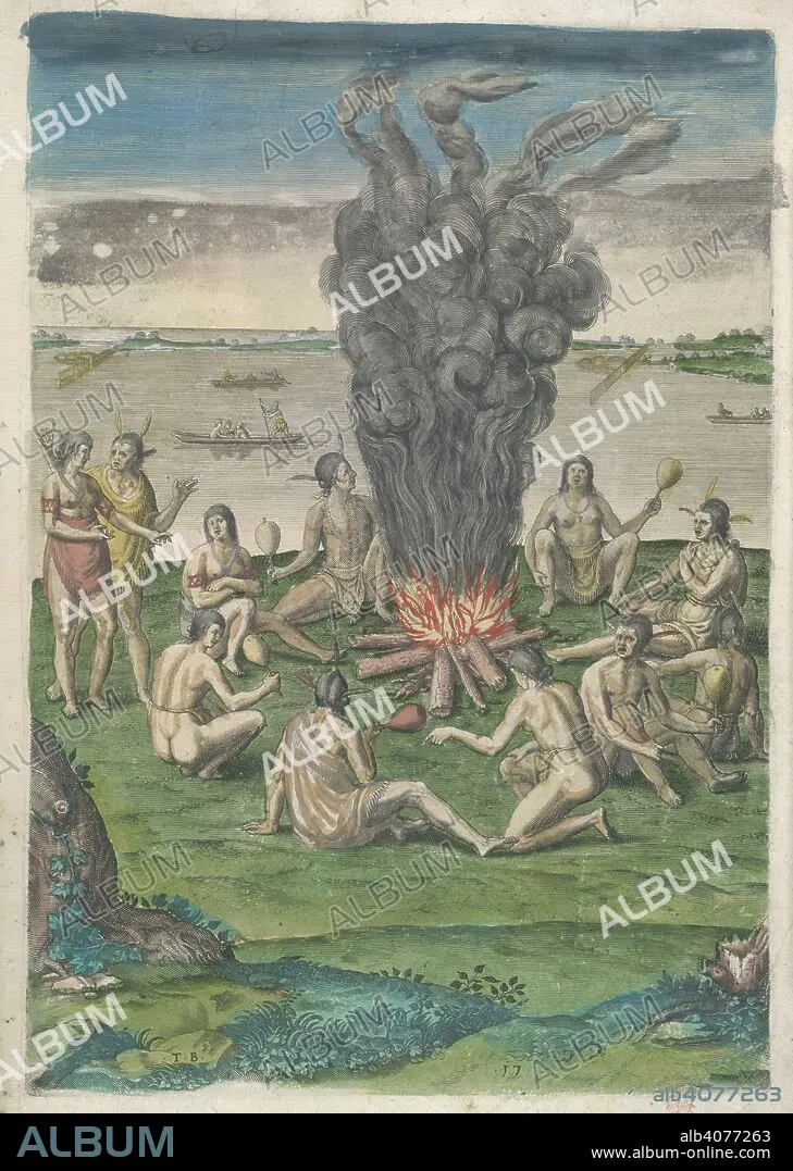 'Their methods of performing a solemn ceremony around a fire'. Engraving of group of ten native Indians seated or kneeling round a wood fire, some holding gourd rattles.Two men wear skin mantles draped over the shoulder, and two women wear apron-skirts. Several wear necklaces.The landscape behind with figures fishing from canoes, and two fish weirs. Travels through Virginia. [From Theodor de Bry's 'America', Vol. I, 1590, after a drawing of John White]. England; 1618. Source: Sloane 1622, f.86. Language: English.