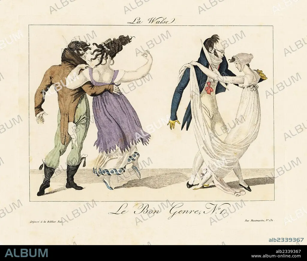 Caption: Merveilleuses and incroyables dancing the waltz, a newly popular dance imported from Germany. Handcoloured engraving from Pierre de la Mesangere's Le Bon Genre, Paris, 1817.