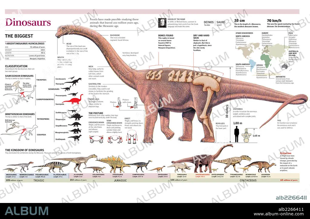Infographics of the anatomy of Argentinosaurus and classification and evolution of dinosaurs.