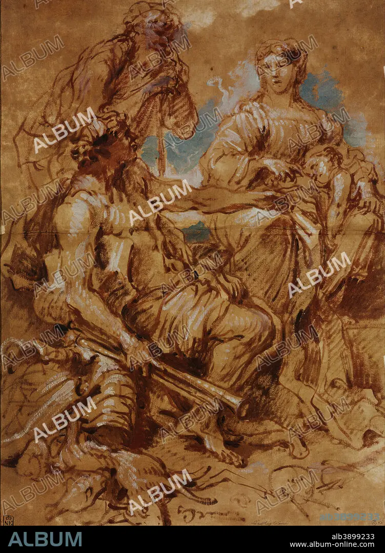 Caption: Allegory in Honour of the Ruling Couple of Mantua. Date/Period: 1652 - 1655. Drawing. Brush with brown and black ink, red-brown, light blue and white oil paint on yellow prepared paper brush with brown and black ink, red-brown, light blue and white oil paint on yellow prepared paper. Height: 455 mm (17.91 in); Width: 332 mm (13.07 in).