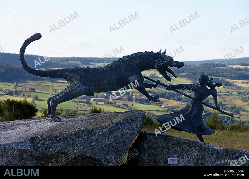 Caption: Monument of the Beast of Gévaudan, village of Auvers, Gévaudan, Monts de la Margeride, Margeride mountains, Haute Loire, Auvergne, France, Europe