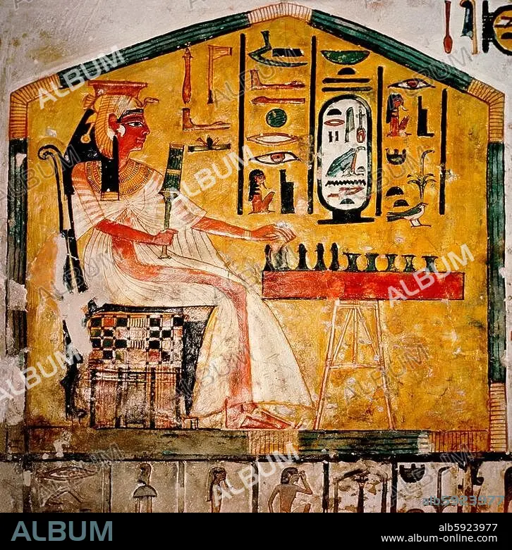 Wall painting from the tomb of Nefertari: the Queen playing senet. Senet became known as the game of passing as in the New Kingdom the passage of the deceased through the Afterlife came to be represented by success in games played against underworld oppo (..)