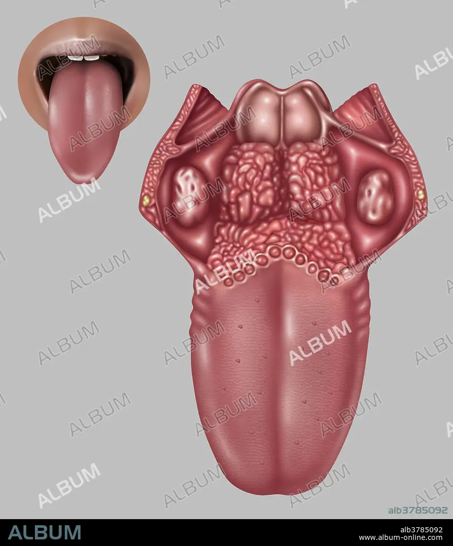 Caption: Illustration depicting the anatomy of the human tongue. Listed at left from top to bottom are: palatopharyngeal arch (at back on sides), lingual tonsil (textured area at back), palatoglossal arch, foliate papillae (feathered part on side of tongue), medial sulcus of the tongue (middle crease), filiform papilla (bottom outer area), epiglottis (top middle), palatine tonsil (round textured areas on upper sides), terminal sulcus (middle centre back), vallate papilla (circumvallate papilla) (round and forming a 'V'), fungiform papilla (middle sides of tongue).