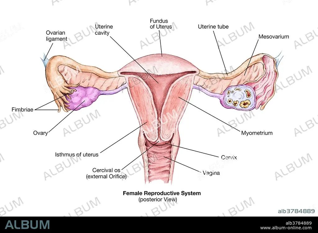 Caption: Labeled anatomical illustration of the female reproductive system.