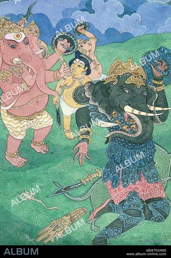HAP-136853 :Hinduism - Hindu art - Himalayan Academy art - India - Religion - Spirituality - Artist S. Rajam - Ganesh - Mushika - demon - asura - Ganesha defeats asura - mouse - vahana - mount Kailash - devas - warriors - arrows - Ganesha - God - Lord of Obstacles - Indian art - Hindu - art - religion - Hindu religion - Hindu belief -