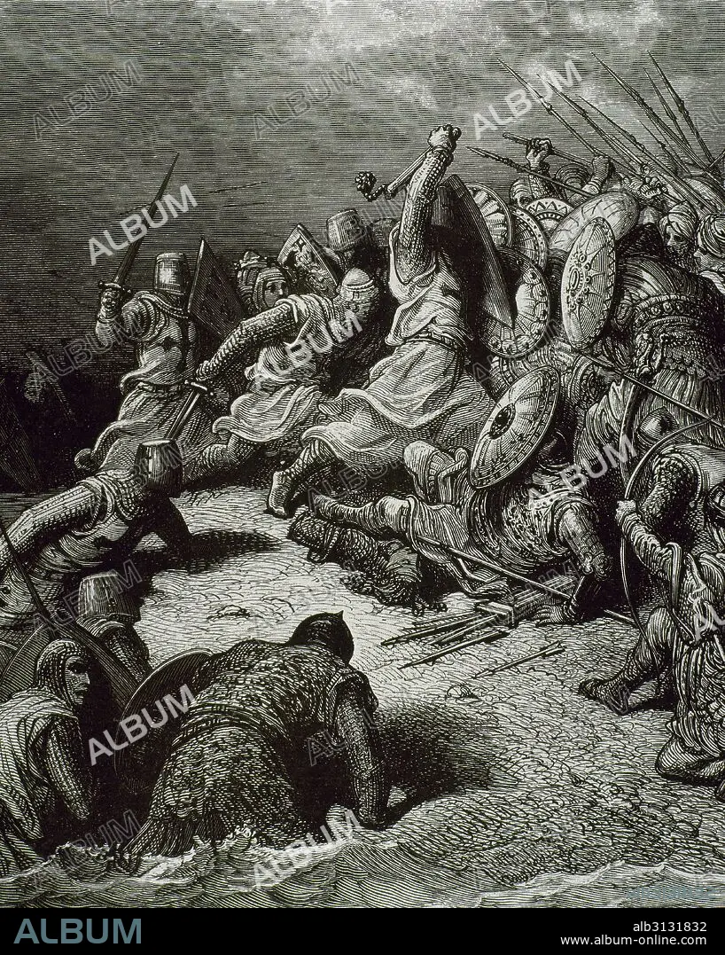 Crusades. Struggle between Christianity and Muslim forces. Battle scene. Engraving by Gustave Dore (1832-1883).