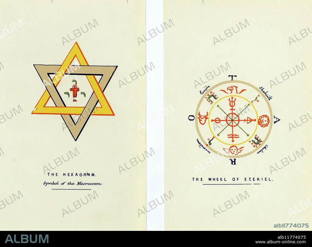 MAGIC SYMBOLS - THE HEXAGRAM AND THE EZEKIEL WHEEL. Magic symbols drawn up with specific reference to a study of the secret design of the Tarot deck. [Left] The Hexagram, symbol of the Macrocosm, sometimes called The Seal of Solomon. The yellow-red triangle represents the upward striving mingling and intersecting with the downward-direction of the other triangle. It is the meeting of the two triads - one is the supernatural Trinity, the other the three-fold man (the Man of Thinking, Feeling and Willing): in magical terms, this is the meeting of the Macrocosm and the Microcosm. In the centre of the figure is the Tau cross, and three Hebrew letters - the yod. [Right] The Wheel of Ezekiel, as visualised by Eliphas Levi: the four letters on the outer periphery spell either ROTA or TAROT, which ae related in an occult sense. The outer concentric contains the four emblems of the fixed signs of the zodiac and of the four Evangelists, interspersed with the four Hebrew letters of the Tetragrammaton (four-lettered name of God). The inner circle contains a fourfold symbol comprising a cross, the top marked with the sigil for Mercury, the left marked with the sigil for Salt, and the right marked with the sigil for Sulphur (these three represent the Three Principles within the human being). The bottom line of the cross is marked with the sigil for Aquarius - the 'human' Age to come. The two designs are lithographic facsimiles of drawings done by the French occultist, Eliphas Lévi, in W. Wynn Westcott, The Magical Ritual of the Sanctum Regnum, 1896.
