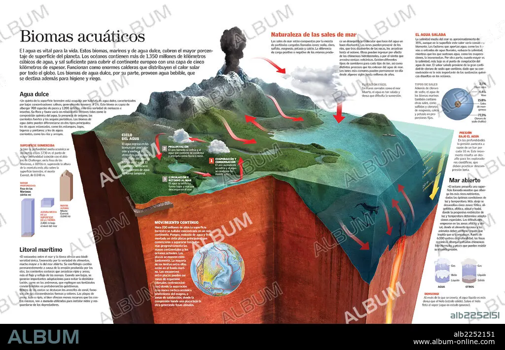 Caption: Infographic of the the earth's different aquatic biomes, ranging from their various compostions according to their salinity, to their ecosystems and biodiversity.