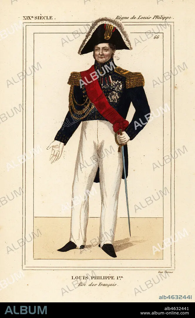 Caption: King Louis Philippe I of France 1773-1850. In the uniform of a colonel in the Garde Nationale with grand-cordon bleu sash. Handcoloured lithograph from Le Bibliophile Jacob aka Paul Lacroix's Costumes Historiques de la France (Historical Costumes of France), Administration de Librairie, Paris, 1852.
