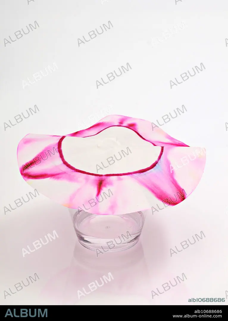 Caption: Paper chromatography is a physical method for separating mixtures. In this sequence a piece of filter paper is folded in a cone and placed over a glass of vinegar, such that the top of the cone is slightly above the rim. A coloured washable marker is used to draw a circle around the centre of the paper. When the vinegar reaches the paper, the ink dissolves and travels outward with the vinegar, in the process separating into constituent pigments.