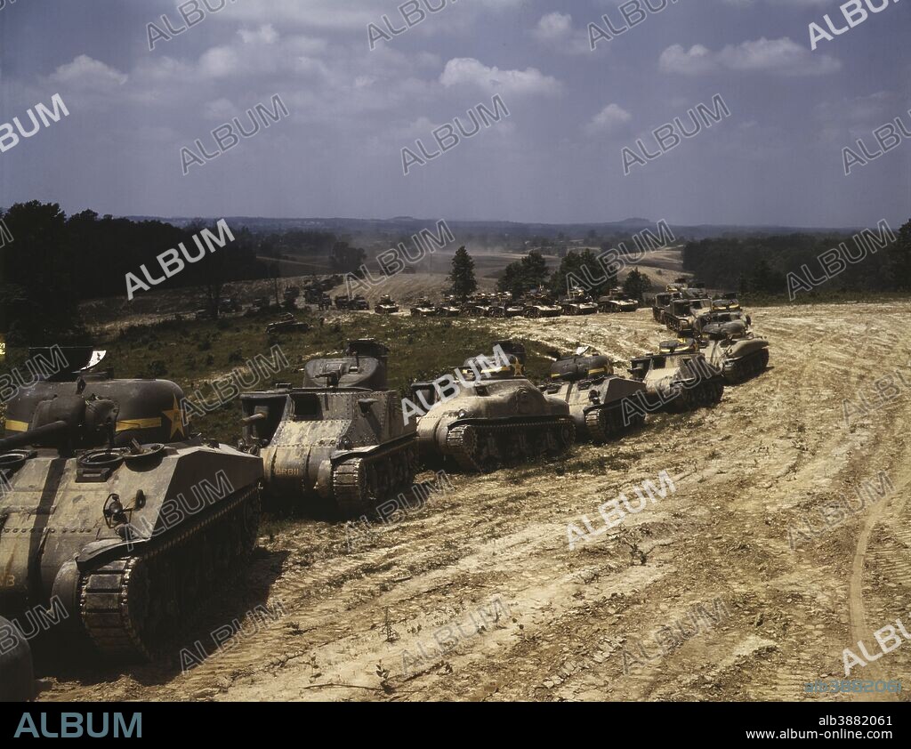 June 1942 - Convoy of M4 (General Sherman) and M3 (General Grant) tanks in training maneuvers, Fort Knox, Kentucky. Note the lower design of the M4, the larger gun in the turret and the two hatches in front of the turret.