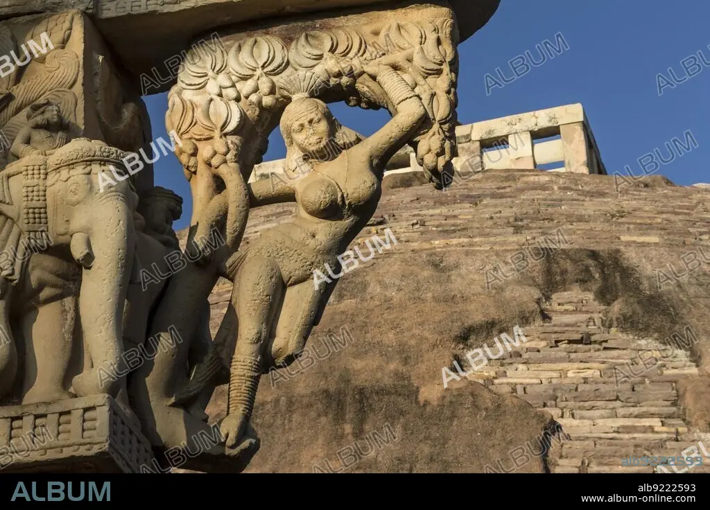 Caption: Yakshini (Yakshi) of the East Torana, gateway to the Great Stupa, Stupa 1, at Sanchi, some trees. The main monument in the group of Buddhist Monuments at Sanchi. UNESCO World Heritage Site. Sanchi, Madhya Pradesh, India, Asia