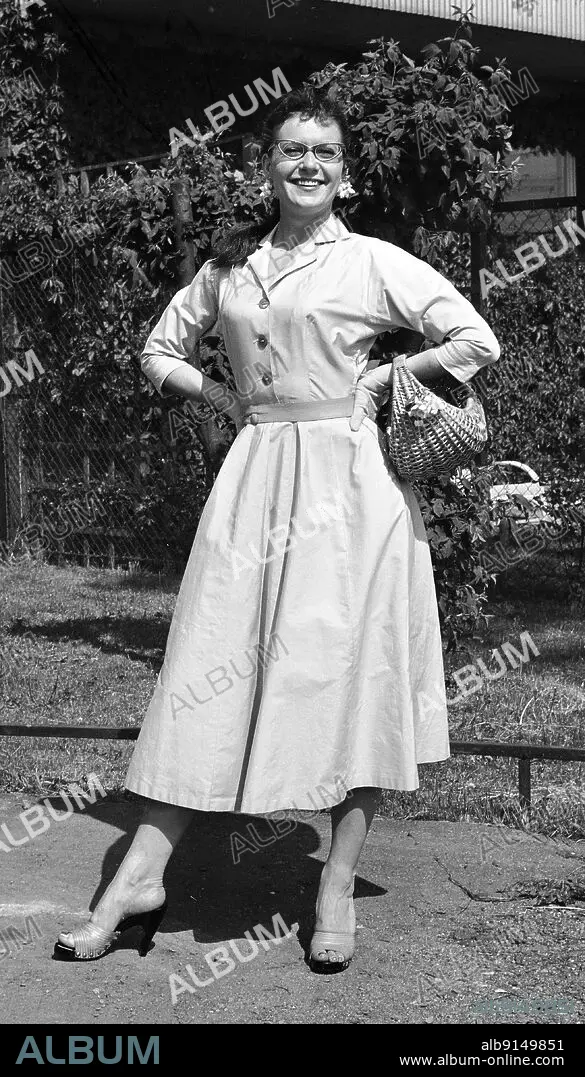 Caption: Oslo 1957-06-20 actor Mona Hofland shows fashions. Here in a light dress and with basket on the arm. Photo: NTB / NTB