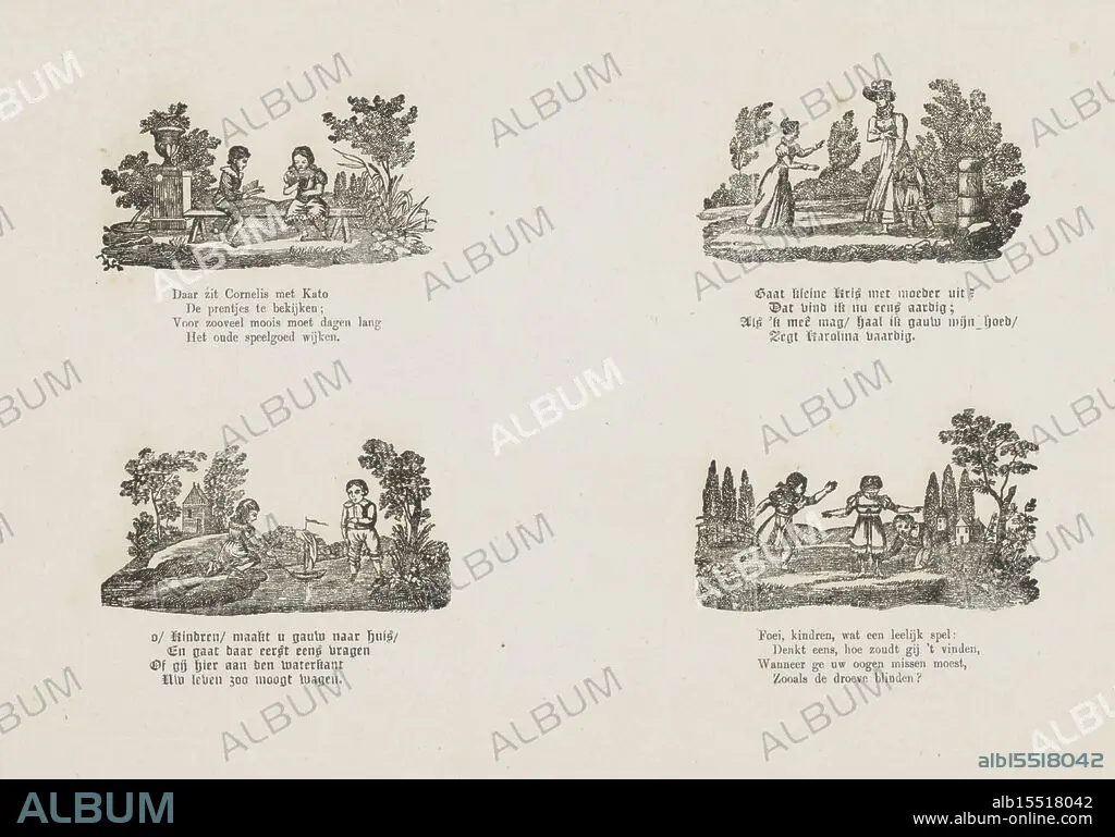 Caption: Witmond, J., Amsterdam, Bremer, HM, Bremer's prentenboek., met bijtitels, van, J. Witmond, Kindervermaken, verso - gestempeld, Blad met 7voorstellingen van activiteiten voor kinderen, zoals lezen, bloemen en spelen, en bubbleblaas. Onder elkaar de beeld een four-line verse, enkele in gothic script ... mm, Publication (Event), Publication, Dutch, publisher, 1867 - 1883, paper, woodcut, letterpress printing, print maker, printmaker, writer