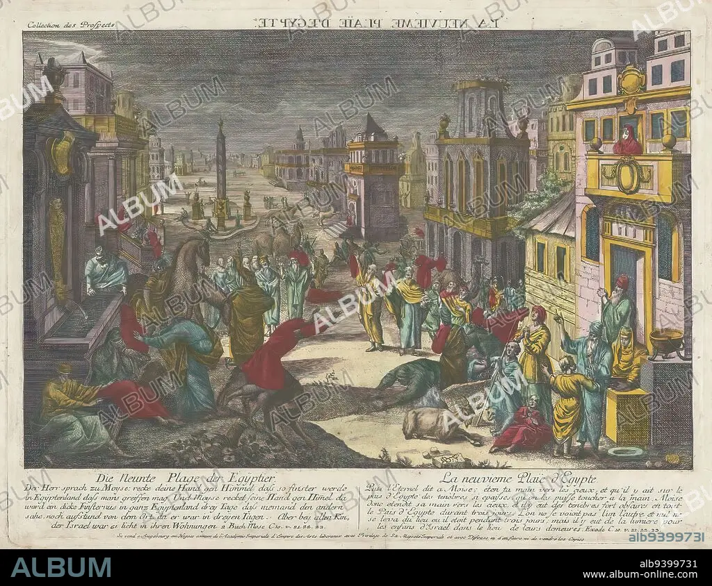 Caption: The Ninth Plague in Egypt, Die neunte Plage der Egyptier (title on object), The Plague of Darkness. View of a square in a city with an obelisk in the center, under a black sky. The people in the street grope around, stumble and look up with folded hands. Below the image explanations in German and French., publisher: Kaiserlich Franziskische Akademie, (mentioned on object), print maker: Monogrammist BF, (mentioned on object), Jozef II (Duits keizer), (mentioned on object), publisher: Augsburg, print maker: Germany, 1755 - 1779, paper, etching, brush, height 329 mm × width 427 mm