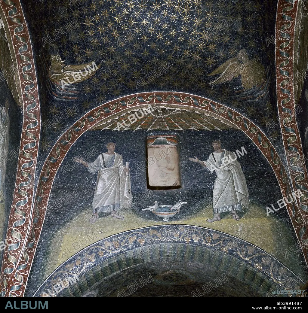 Caption: Mosaic of St Paul (left) and St Peter (right) in the Mausoleum of Galla Placidia, 5th century.