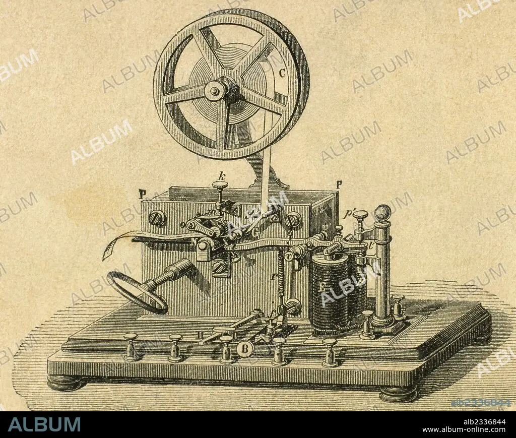 Morse System. Morse telegraph reciever. Engraving 19th century.