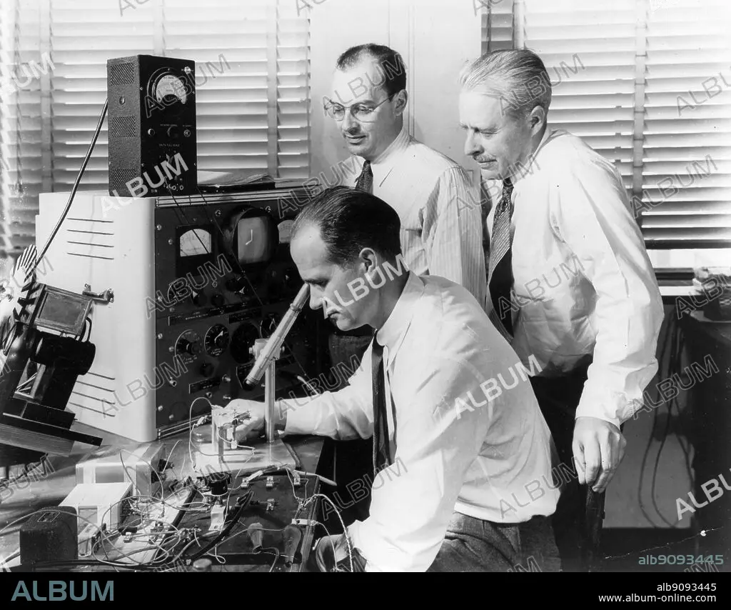 Nobel Prize Winners Drs Wiliam ( William ?) Shockley (seated), John Bardeen (left) and Walter H Brattain, at Bell Telephone Laboratories in 1948 with the apparatus used in the first investigations that led to to the invention of the transistor, which was announced by Bell Laboratories in 1948