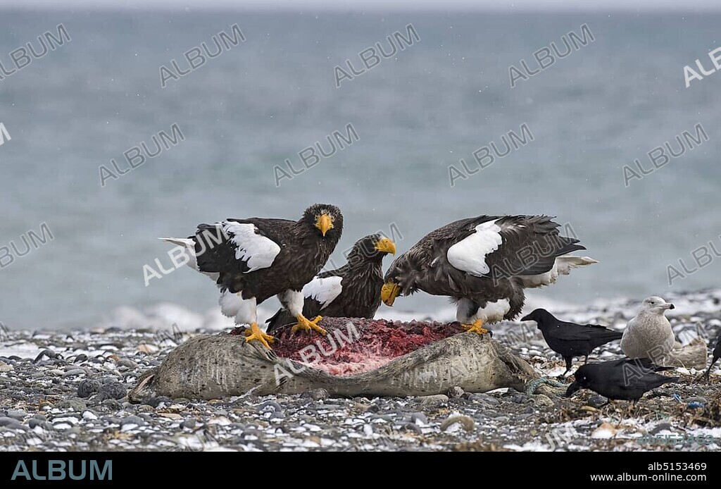 Steller's Sea-eagle (Haliaeetus pelagicus), three adults, feeding at dead seal carcass, Shiretoko Peninsula, Hokkaido, Japan, Asia