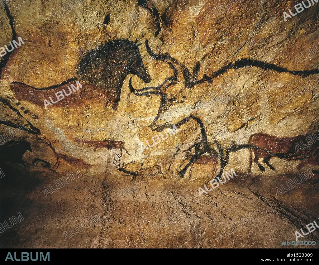 Caption: Prehistory, France, Upper Paleolithic, Perigordian - Reconstruction of the rock paintings of Lascaux caves - Bulls
