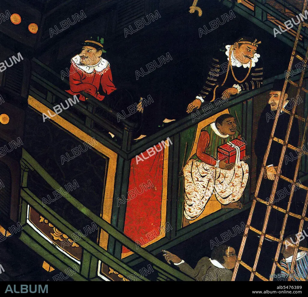 Caption: Kani Naizen (1570 - 1616) was a Japanese painter of the Kani school, particularly known for his screen paintings (byi bu) of Namban (Southern Barbarians, i.e. Europeans). The Nanban trade (Nanban bi eki, 'Southern barbarian trade') or the Nanban trade period (Nanban bi eki jidai, 'Southern barbarian trade period') in Japanese history extends from the arrival of the first Europeans - Portuguese explorers, missionaries and merchants - to Japan in 1543, to their near-total exclusion from the archipelago in 1614, under the promulgation of the 'Sakoku' Seclusion Edicts.