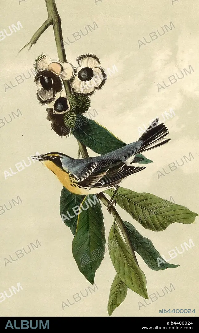 Caption: Yellow-throated Wood Warbler - Chinquapin Castanea pumila, Golden-throated Warbler (Dendroica dominica, Sylvicola pensilis), Chestnut Tree, Signed: J.J. Audubon, J.T. Bowen, lithograph, Pl. 79 (vol. 2), Audubon, John James (drawn); Bowen, J. T. (lith.), 1856, John James Audubon: The birds of America: from drawings made in the United States and their territories. New York: Audubon, 1856