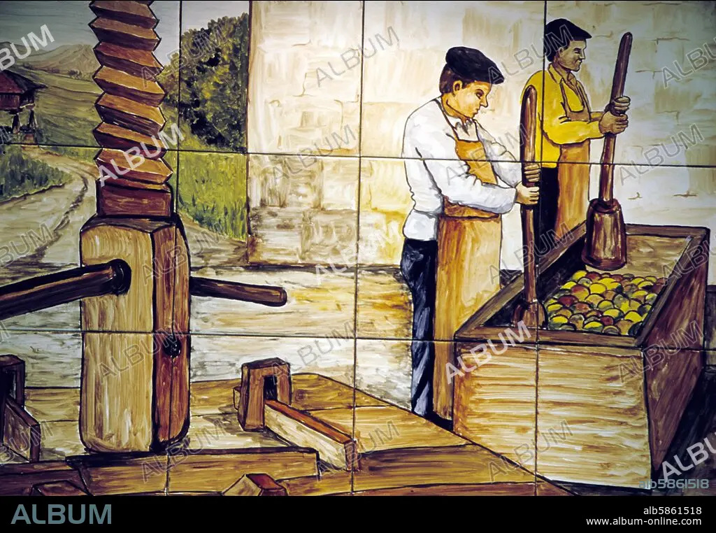 Caption: Oviedo; Sidrería "El Pigüeña" en la calle Gascona; mosaico con temática alusiva a sidra