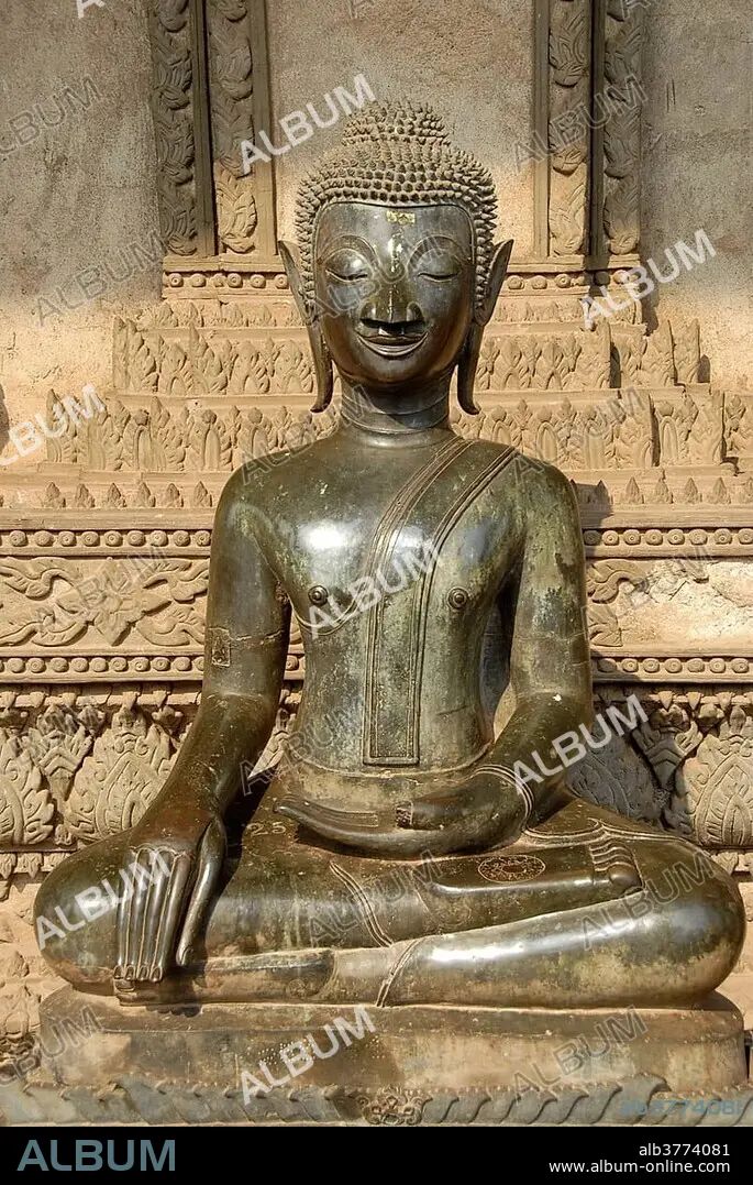 Caption: Theravada Buddhism, ancient Buddha statue in bronze in meditation, Bhumisparsha Mudra, Bhumisparshamudra, gesture to call upon the earth, Haw Pra Kaeo museum, Vientiane, Laos, Southeast Asia, Asia