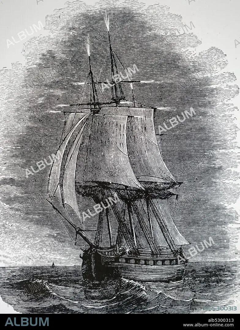 Engraving depicting St Elmo's fire appearing on a sailing ship's mast.