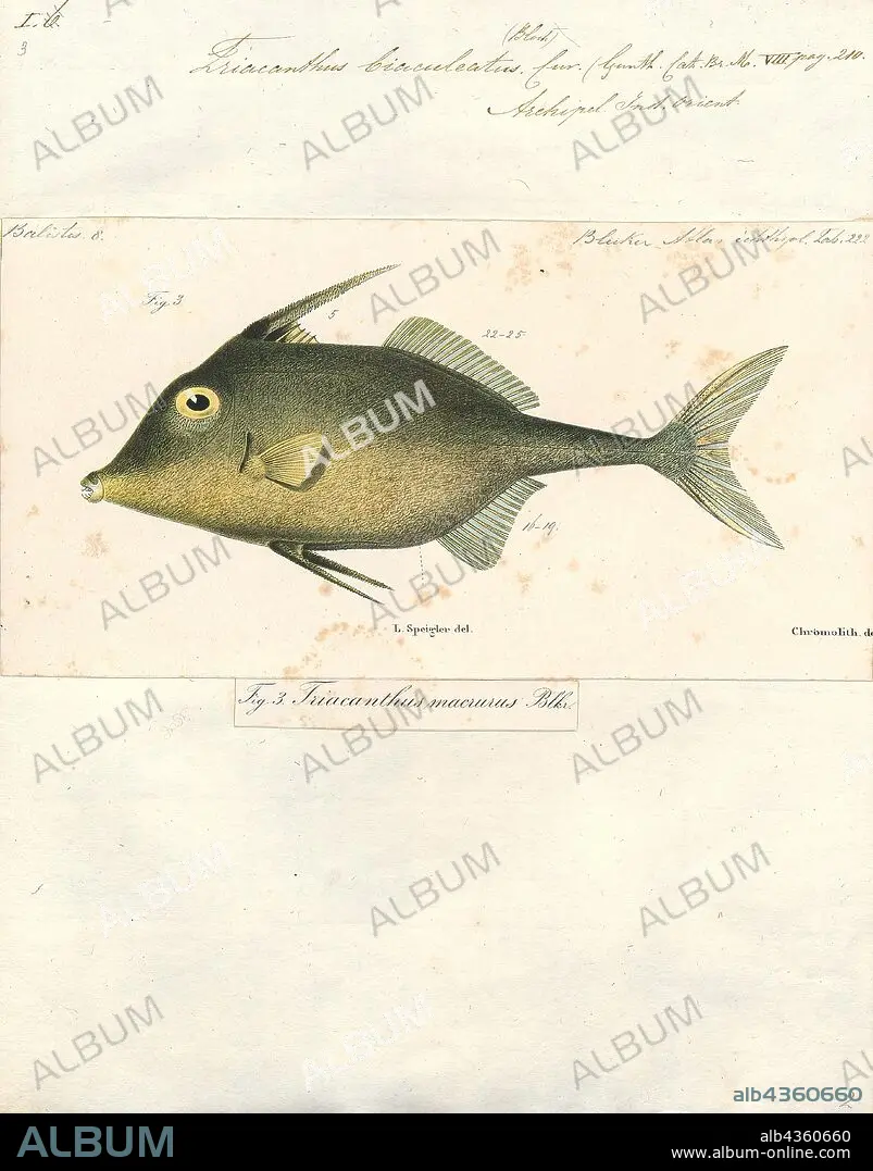Triacanthus biaculeatus, Print, Triacanthus biaculeatus, also known as the Short-nosed tripod fish, is a species of marine fish in the family Triacanthidae. It is native to the Indian Ocean and the western Pacific Ocean. Its caudal fin is yellow., 1700-1880