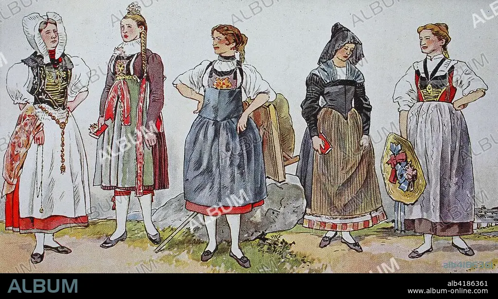Caption: Fashion, costumes, clothing in Switzerland in the mid-19th century, from the left, farmers wife from Olten, canton of Solothurn, bride from Guggisberg, canton of Berne, working costume by Guggisberg, churchgoer from the Simmental, canton Bern and a farmers wife from the canton of Lucerne, digital improved reproduction from an original from the year 1900