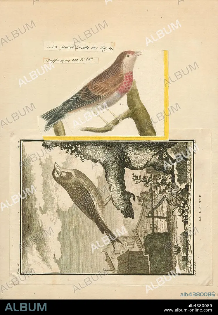 Caption: Linaria cannabina, Print, The common linnet (Linaria cannabina) is a small passerine bird of the finch family, Fringillidae. It derives its scientific name from its fondness for hemp and its English name from its liking for seeds of flax, from which linen is made., 1700-1880