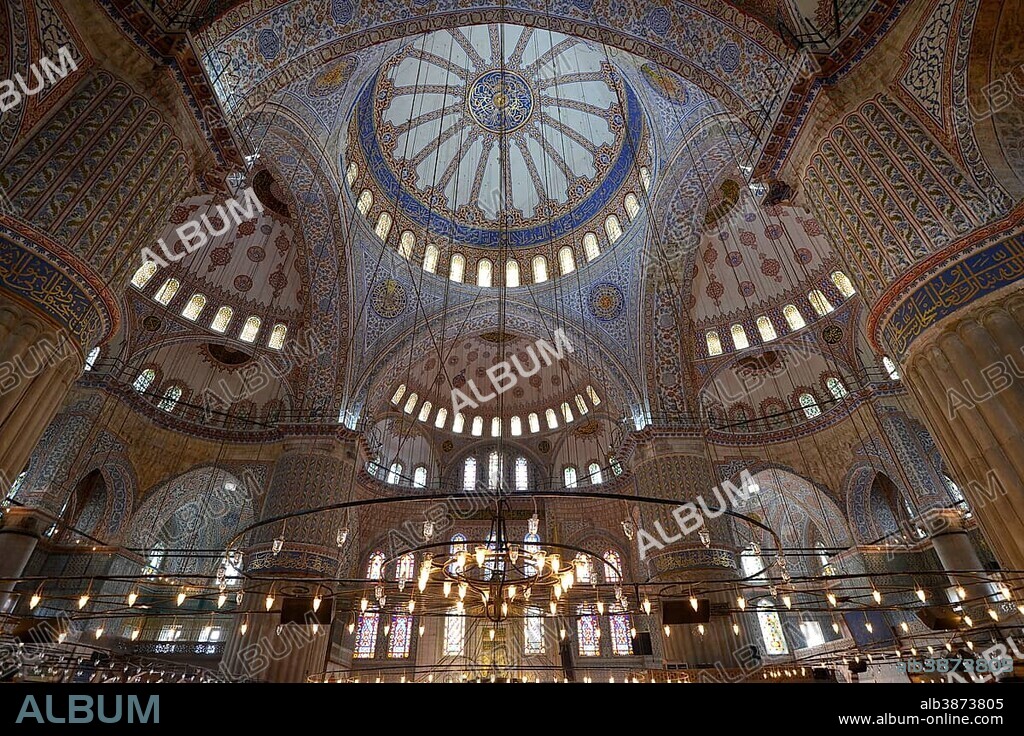 Caption: Vaulted ceiling, ornate domes, interior of Sultan Ahmed Mosque, Blue Mosque or Sultanahmet Camii, Sultanahmet, Eminönü, Istanbul, European side, Istanbul Province, Turkey, European side, Europe