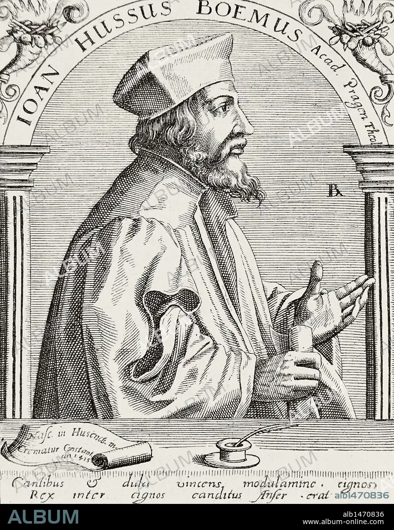 Caption: Jan Hus (1369-1415). Czech priest, philosopher, reformer, and master at Charles University in Prague. Excommunicated in 1410 to propagate the doctrines of Wycliffe. Under the protection of King Wenceslas and safe conduct of the Emperor Sigismund, in 1414 attended the Council of Constance, where he was tried and burned for heresy. This triggered the Hussite uprising (1419-1434), history of religious wars. Engraving.