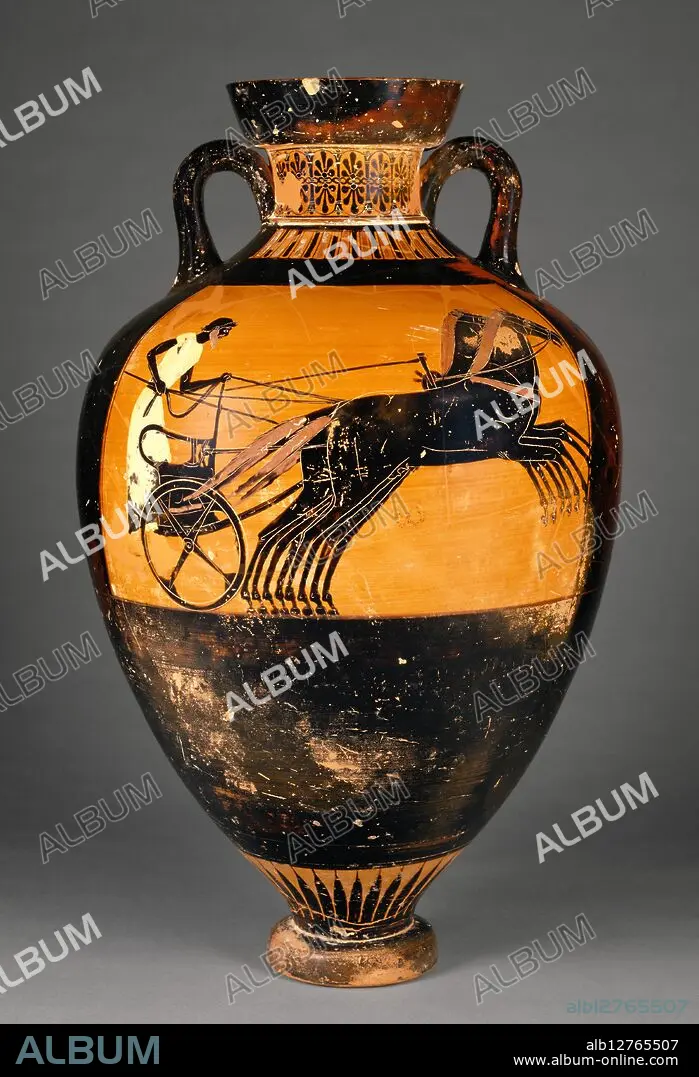 Caption: Attic Panathenaic Amphora, 500-480 BC. Prize Vessel with a Chariot Race. Additional Info: The Greater Panathenaia, a state religious festival, honored Athena, the patron goddess of Athens. Held every four years, the festival included athletic and musical competitions, and amphorae filled with oil from Athena’s sacred olive trees were given as prizes in the Panathenaic Games. These Panathenaic Amphorae had a distinctive form with narrow necks and feet, and received standard decoration, always in the black-figure technique. On the front, Athena in her guise as "Promachos" - in the frontline of battle - strides forth between columns. Running along one of the columns is the official inscription, "of the prizes from Athens." The back depicts the event for which the vase was a prize, in this case the four-horse-chariot race, one of the most prestigious events in the games.