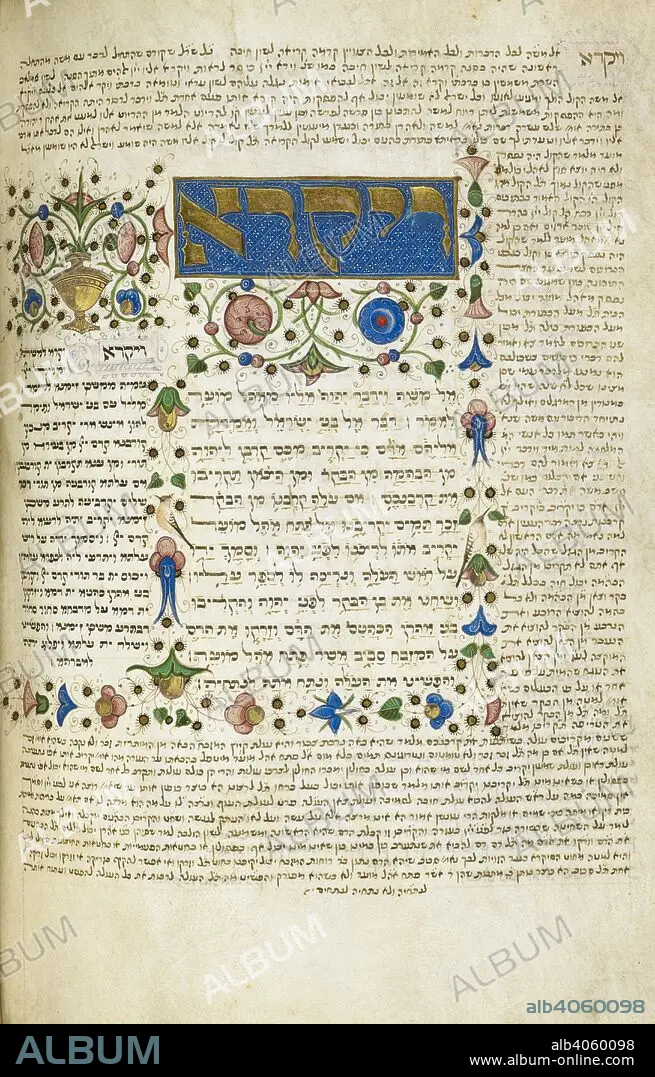 Initial-word panel decorated with floral border inhabited by birds, at the beginning of the Book of Leviticus. Pentateuch with Rashi's commentary and Targum Onkelos. Italy, N. E. (Ferrara?); 3rd quarter of the 15th century. Source: Harley 7621, f.142v. Language: Hebrew, Aramaic.