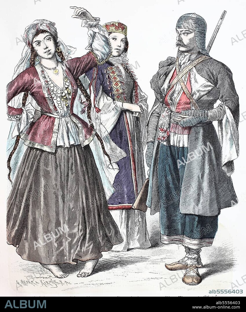Caption: Folk traditional costume, clothing, history of costumes, bayadere from Chematha, Georgian woman, circassian from Khevsur, Caucasia, Caucasus, 1885, digitally restored reproduction of a 19th century original, exact date unknown