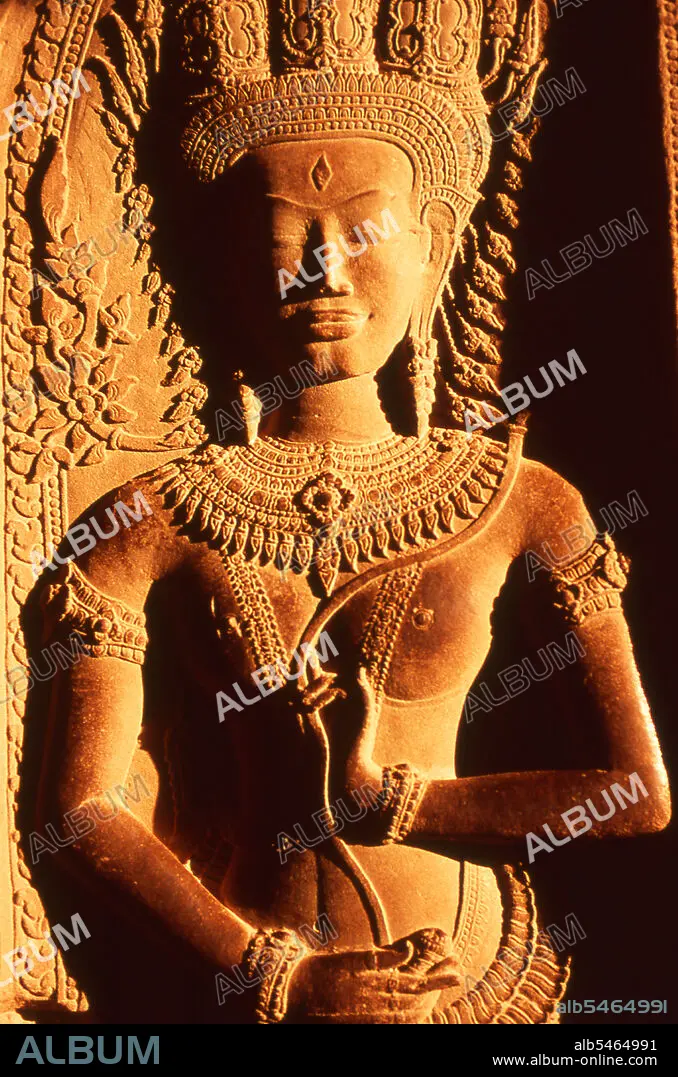 Title: The late afternoon sun illuminates an apsara on the upper level of the central sanctuary, Angkor Wat.