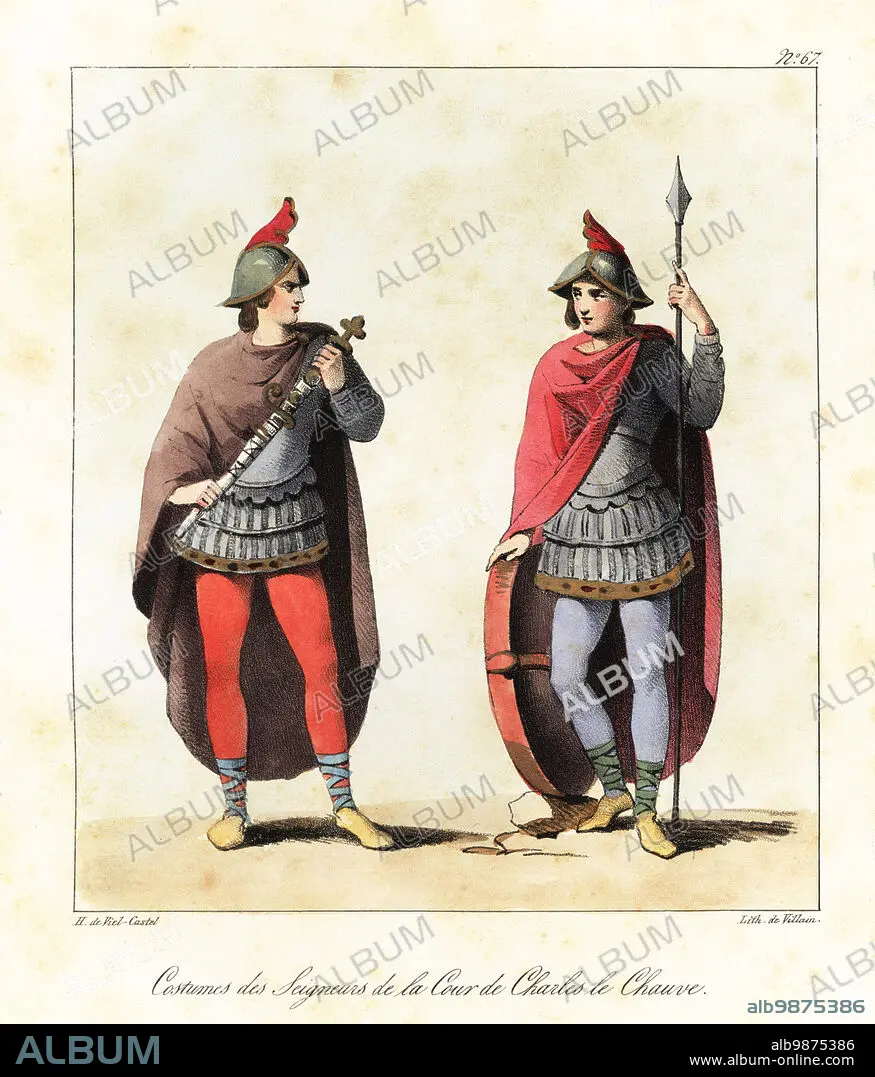 Caption: Costumes of Frankish lords at the court of Charles the Bald, 9th century. In helmets, cloaks, armour, hose, with sword, lance and shield. From an illuminated manuscript showing Charles the Bald receiving the Vivian Bible. In the Vivian Bible or First Bible of Charles le Chauve, 845. Costumes des Seigneurs de la Cour de Charles le Chauve. Handcoloured lithograph by Villain after an illustration by Horace de Viel-Castel from his Collection des costumes, armes et meubles pour servir à l'histoire de la France (Collection of costumes, weapons and furniture to be used in the history of France), Treuttel & Wurtz, Bossange, 1827.