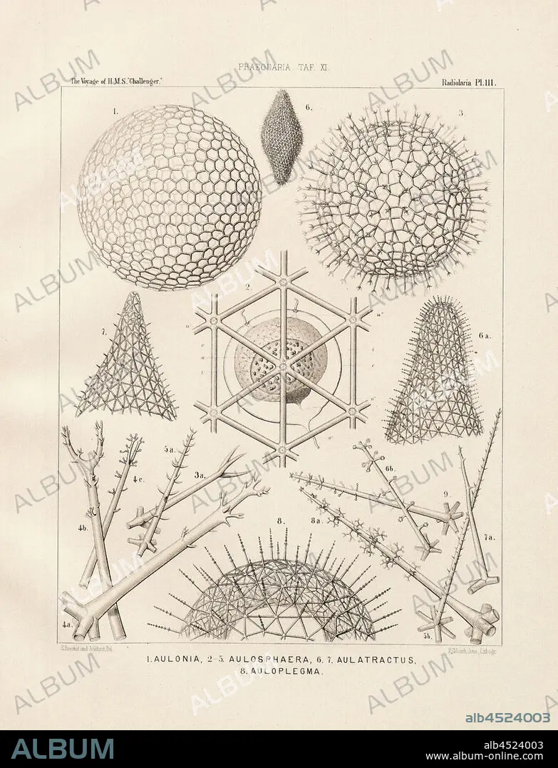 Caption: Aulonia, Aulosphaera, Aulatractus, Auloplegma, Illustration of several radiant animals of the group Phaeodaria from the 19th century, signed: E.Haeckel and A. Giltsch Del, F. Giltsch, Jena, Lithogr, Pl. 111, after p. 31, Haeckel, Ernst (del.); Giltsch, A. (del.); Giltsch, F. (lith.); Jena (lith.), 1862, Ernst Haeckel: Die Radiolarien (Rhizopoda Radiaria). III. und IV. Theil. Berlin: Verlag von Georg Reimer, 1862-1888