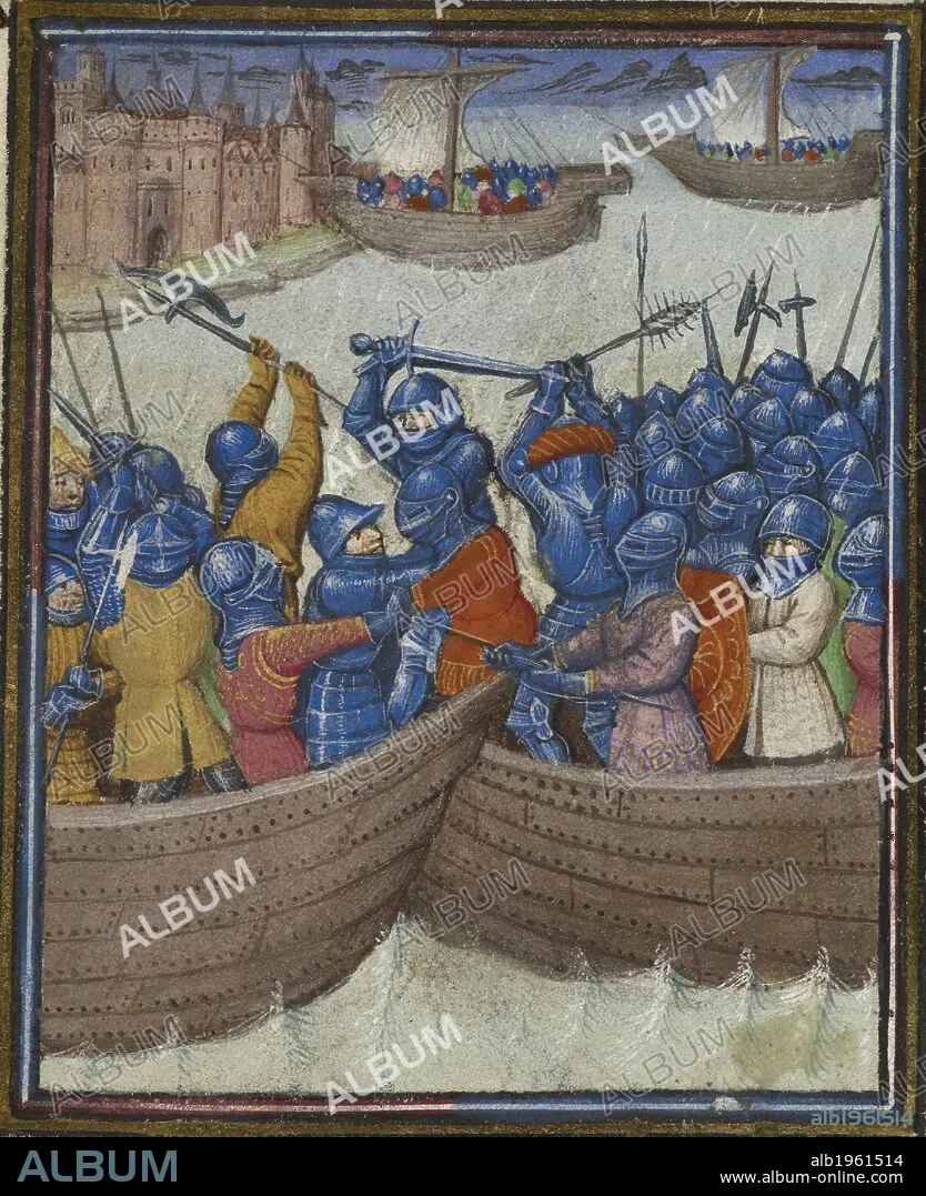 Miniature depicting a battle scene at sea, decorated initial 'L'(istoire) including heraldic arms and foliate borders. Roman de Mélusine. France, N. (Amiens). c.1450. Medieval work Attributed to the quy Master. Source: Harley 4418, f.80v. Language: French.