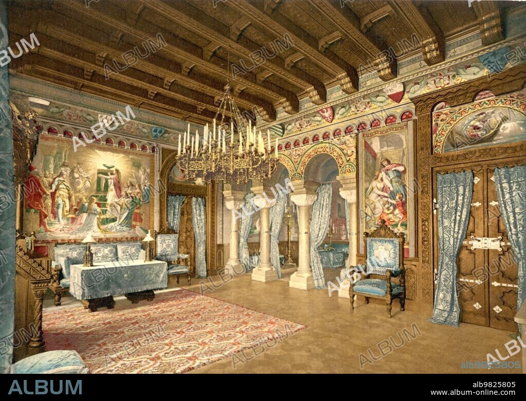 Caption: Picture cycle of the Lohengrin opera in Neuschwanstein Castle; Bavaria; Germany; Historic; digitally restored reproduction of a photochrome print from the 1890s; Europe
