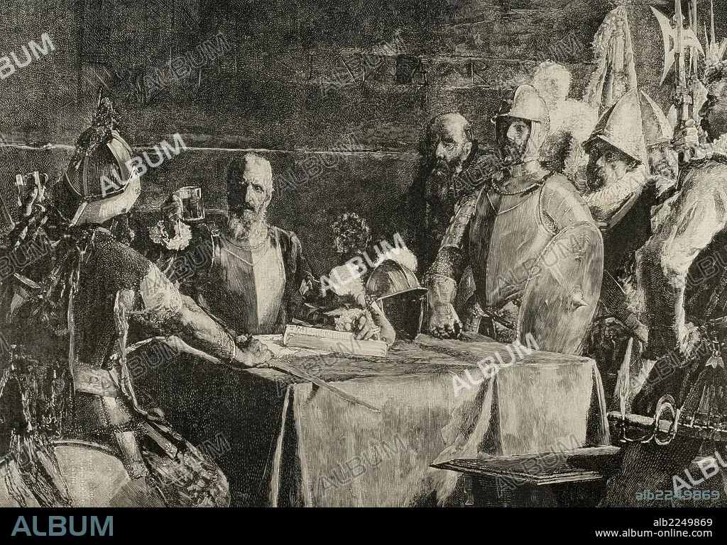 Caption: Miguel Lopez de Legazpi (1503-1572). Spanish admiral and governor. The Blood Compact's ceremony between Legazpi and Sikatuna, king of Philippines. Engraving.