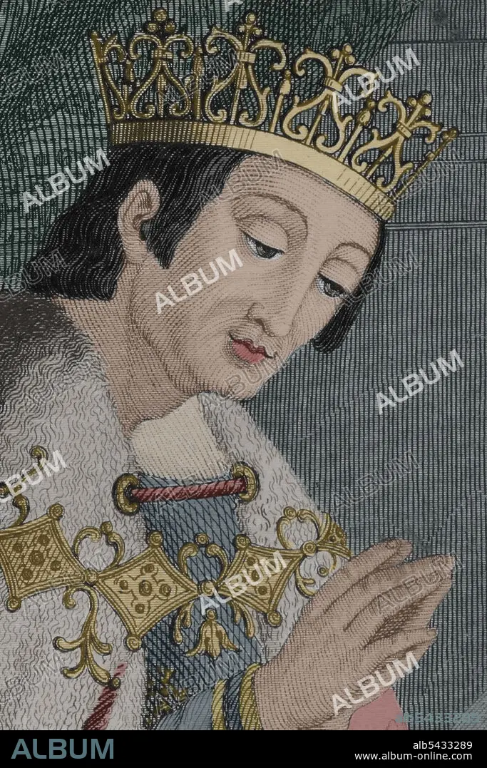 Caption: Alfonso VIII of Castile (1155-1214), called the Noble or the one of the Navas. King of Castile from 1159 and King of Toledo. Portrait, detail. Later colouration. Engraving by Antonio Roca. Las Glorias Nacionales, 1853.
